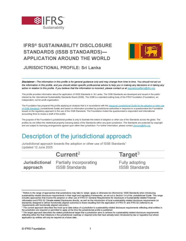 Sri Lanka has been recognised among the first jurisdictions in the world, and in South Asia, to join the global drive to adopt the IFRS Sustainability Disclosure Standards (ISSB Standards). As part of this effort, the IFRS Foundation has released an initial set of 17 jurisdictional profiles, including Sri Lanka, offering capital markets greater transparency on how countries are aligning with the ISSB Standards. This also marks a significant milestone towards establishing a global baseline for sustainability disclosures.