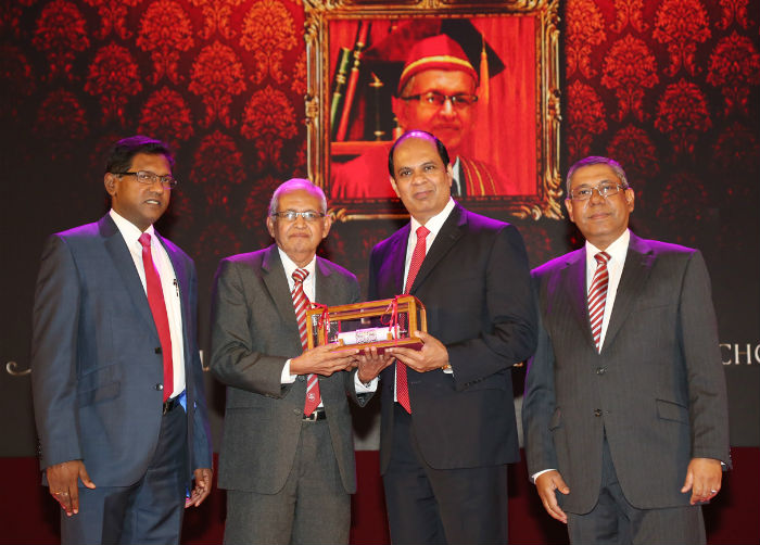 Mr. Fred H. Puvimanasinghe being inducted to CA Sri Lanka Hall of Fame by Mr. Arjuna Herath, President – CA Sri Lanka. Secretary/CEO CA Sri Lanka Mr. Aruna Alwis and Past President CA Sri Lanka Mr. Reyaz Mihular also joined the presentation.