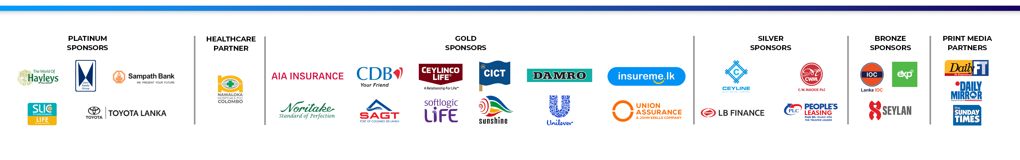 Gold Sponsors are AIA Insurance Lanka Limited, Citizens Development Business Finance PLC, Ceylinco Life Insurance Ltd., Colombo International Container Terminals (Ltd), DAMRO, InsureMe Insurance Brokers (Pvt) Ltd, Noritake Lanka Porcelain Private Limited, Softlogic Life Insurance PLC, South Asia Gateway Terminals (Pvt) Ltd, Sunshine Holdings PLC, Unilever PLC, and Union Assurance PLC, while Nawaloka Hospitals PLC joined as Healthcare Partner.