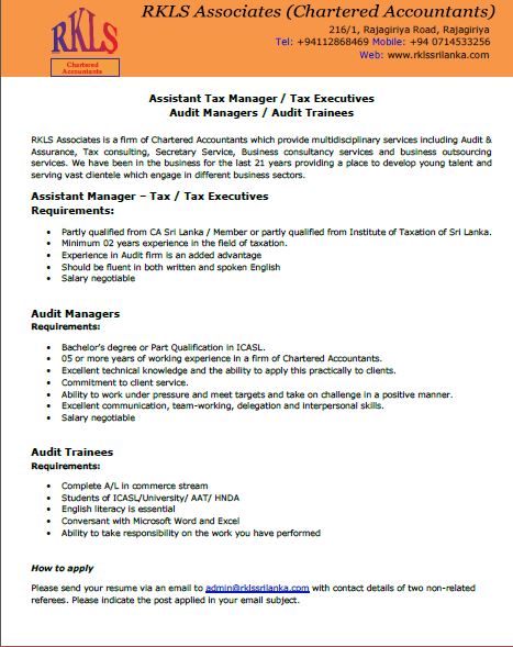 JRN_2662 : Assistant Tax Manager / Tax Executives Audit Managers / Audit Trainees at RKLS Associates